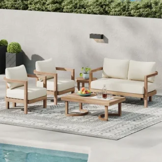 صمم المساحة الخارجية المثالية لك ولأصدقائك للاستمتاع بمشروبكم المفضل ، هذة المجموعة مكونة من أربعة مقاعد بتصميم رائع على شكل لوحة شرائحية ، وستكون إضافة مثالية لأي منطقة جلوس ، هذه المجموعة الساحرة مصنوعة من الخشب الصلب ومُصممة بمنحنيات لافتة للنظر، مما يضفي جمالية فريدة على أي مساحة. من الوسائد المقاومة للماء إلى هيكلها القوي، توفر هذة المجموعة متانة لا مثيل لها وراحة رائعة، مما يجعلها حلمًا لأي فناء خلفي أو فناء.