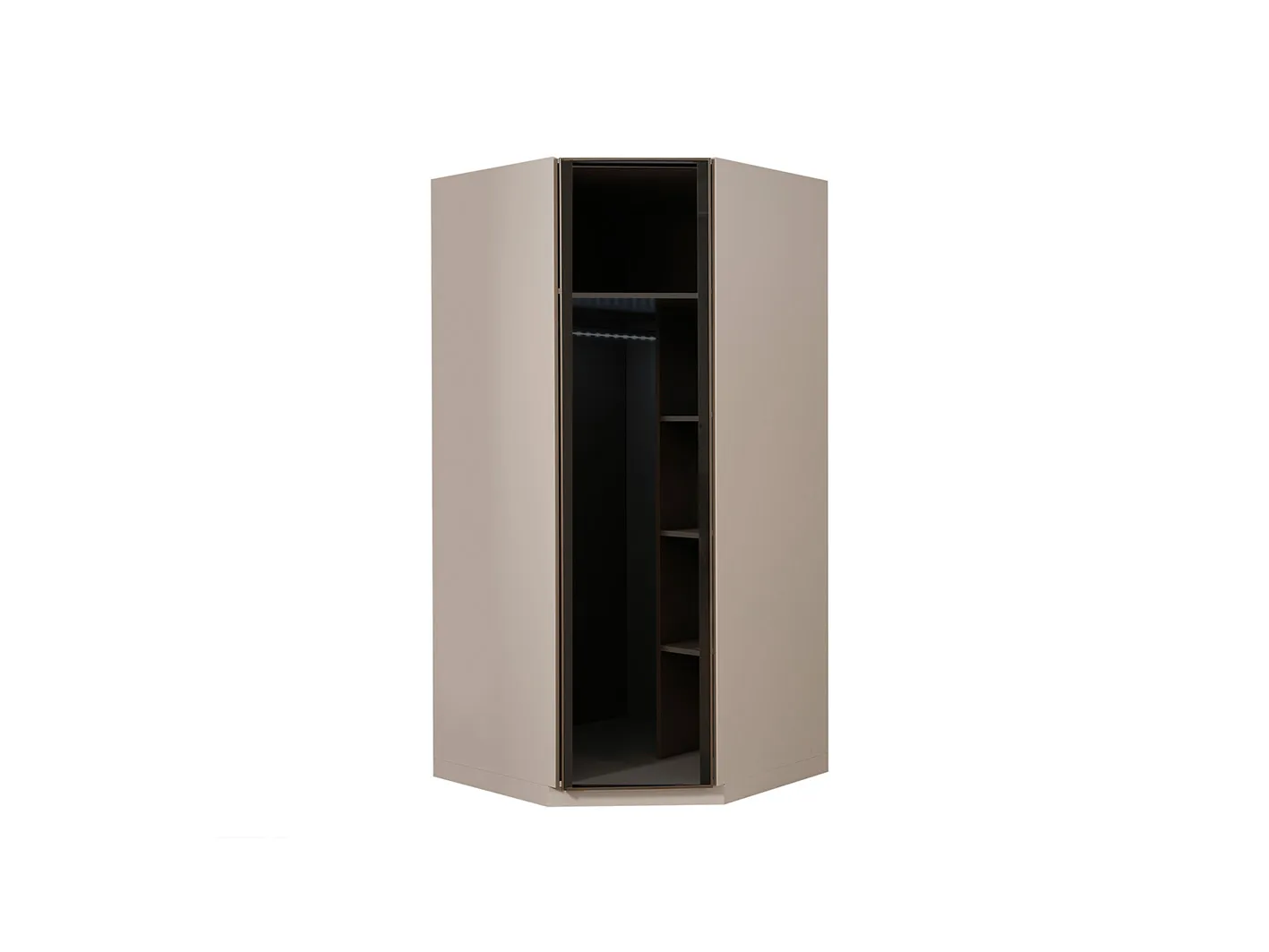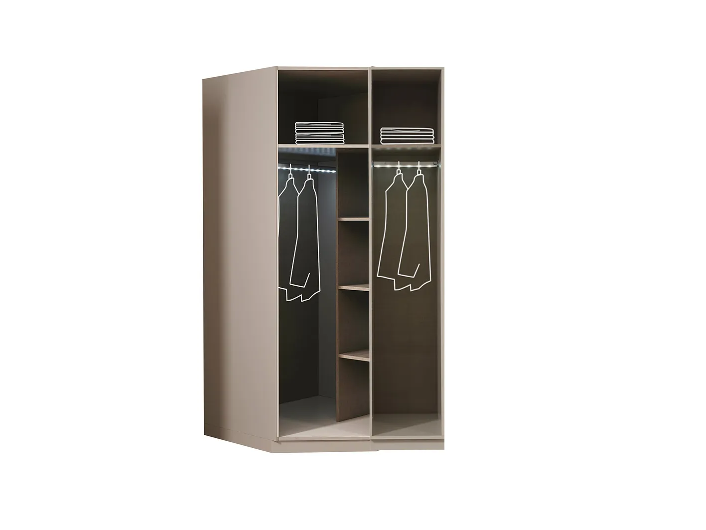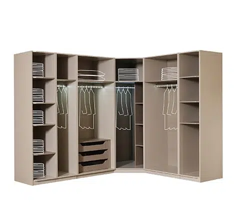 خزانة نور الزاوية الفاخرة من مودرن هاوس، بتصميم تركي راقٍ يستغل المساحات الضيقة بكفاءة مع إضاءة داخلية، إغلاق ناعم، وتنظيم مرن. الحل الأمثل لغرفة نوم مرتبة وعصرية.