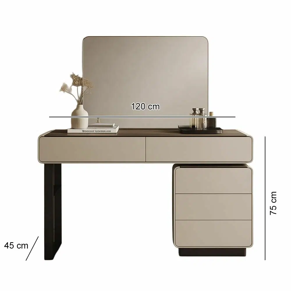 طاولة التزيين سكونا بتصميم فخم وعصري، صنعت من MDF وخشب رقائقي مع مرآة متكاملة وأدراج عملية. مثالية لغرف النوم وتأتي بضمان سنتين وجودة عالية تناسب جميع الديكورات.